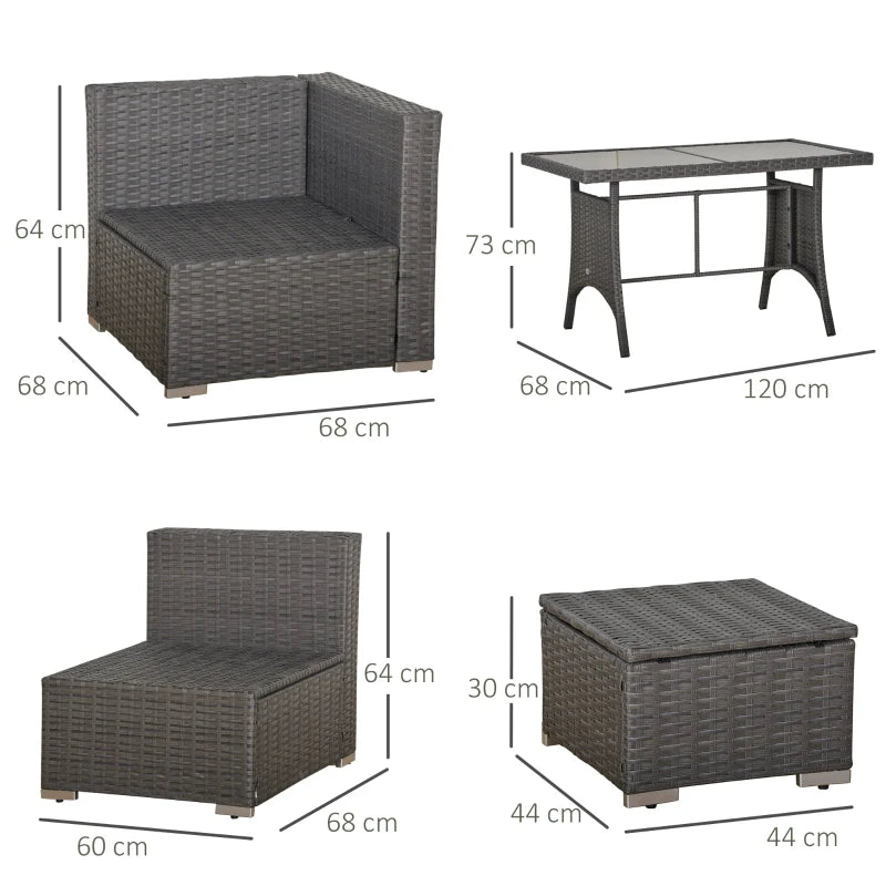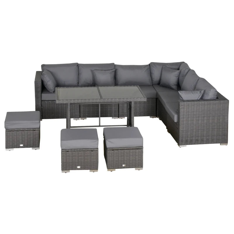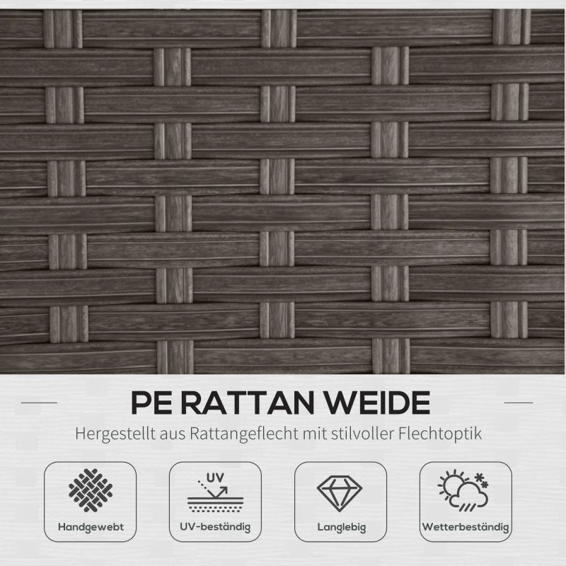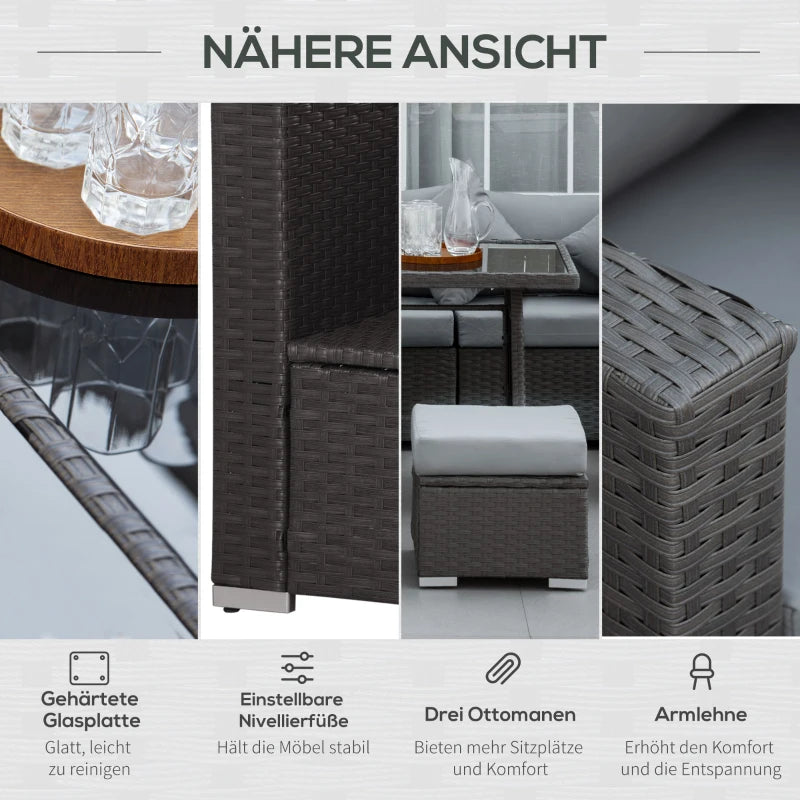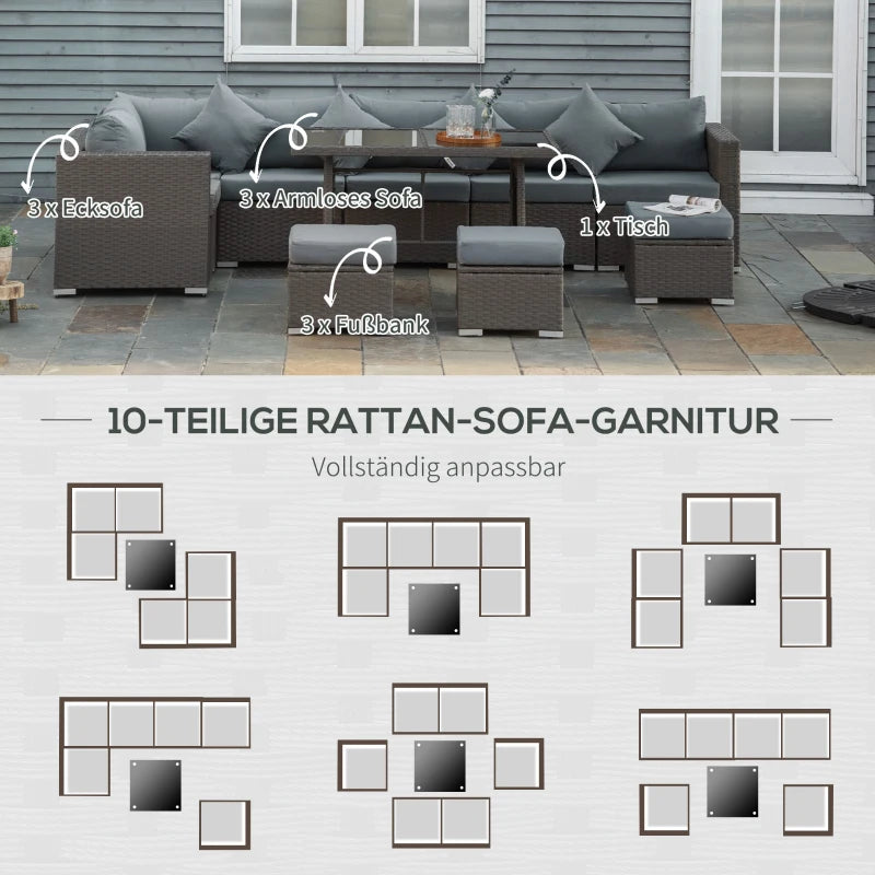 Erleben Sie pure Entspannung an warmen Tagen mit unserer wunderschönen Sofagarnitur von Outsunny. Das 10-teilige Ensemble besticht durch die beliebte Rattanoptik und eine erstklassige Verarbeitung, die Ihre Sitzgruppe zu einem Blickfang machen. Der Beistelltisch mit dekorativer Hartglasplatte lädt zum gemeinsamen Mahl ein und rundet das Ensemble gekonnt ab. Lassen Sie sich von der Schönheit und Qualität dieses großen Möbelsets verzaubern und genießen Sie unvergessliche Momente im Freien!