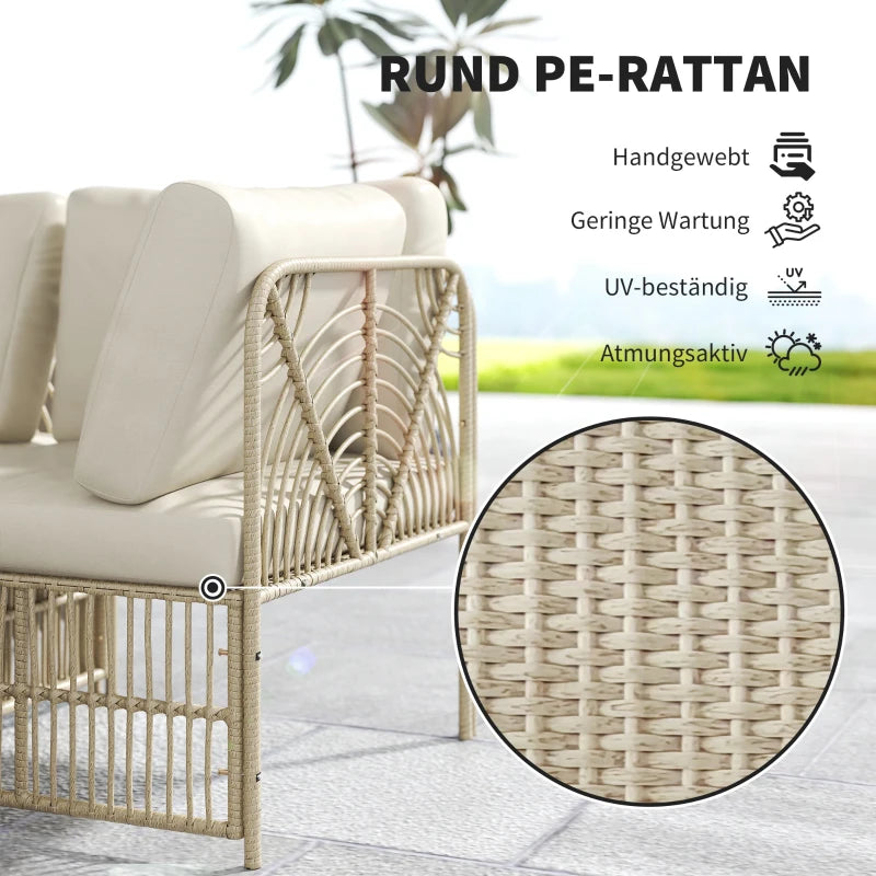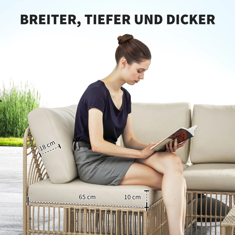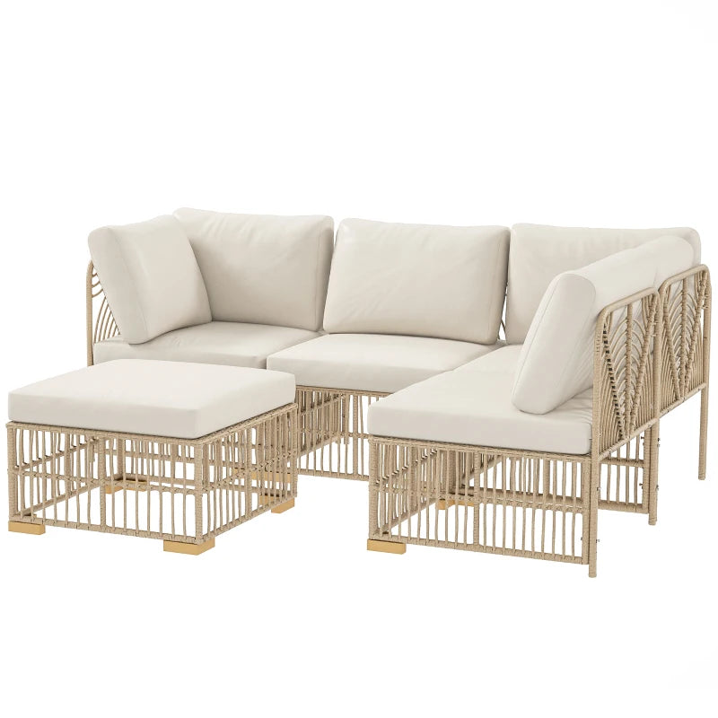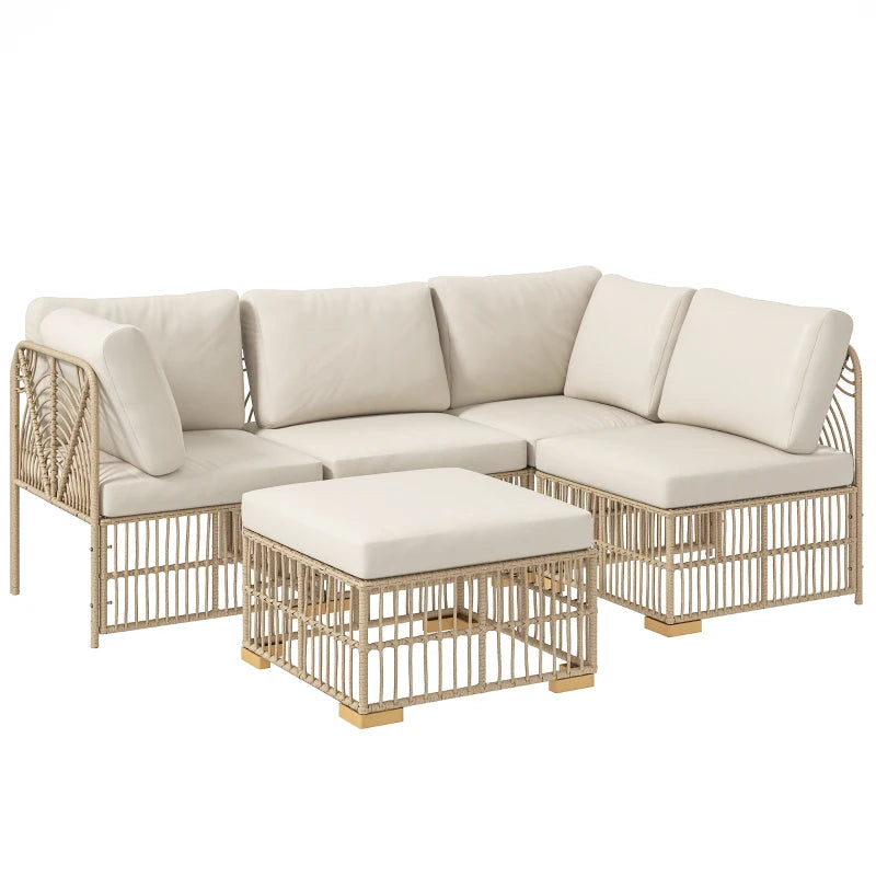 Erleben Sie den Charme und die Flexibilität des Rattan-Gartenmöbel-Sets von Outsunny. Das fünfteilige Polyrattan-Lounge-Set umfasst zwei Eckstühle, zwei Mittelstühle und einen vielseitigen Fußhocker, arrangierbar nach Ihrem Geschmack. Freuen Sie sich auf geräumige und komfortable Sitze der Polyrattan-Ecklounge aus wetterbeständigem Kunststoff-Rattan mit dicken Kissen, für gemütliche Stunden im Freien.