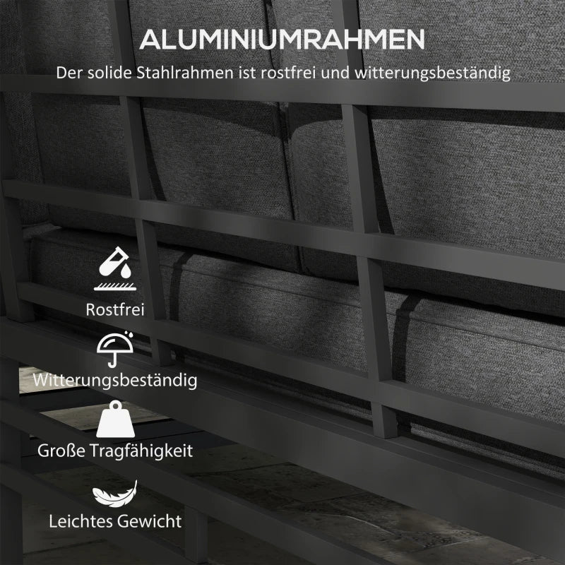 Verwandeln Sie Ihren Garten in eine Oase der Entspannung mit dem Outsunny Gartenlounge Set. Dieses Balkonmöbel Set besteht aus einem robusten Aluminiumrahmen und wird mit dicken Kissen für die Sitzfläche, die Rückenlehne geliefert, die alle mit praktischen Reißverschlüssen versehen sind. Genießen Sie Ihren Kaffee an einem schicken Couchtisch mit eingelegtem Steinfurnier in Holzoptik. Eine großartige Mischung aus Stil und Komfort für Ihre Terrasse oder Ihren Garten.