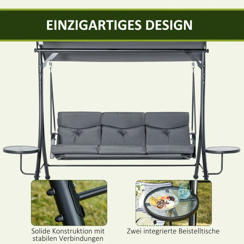 Diese Outsunny Drei-Personen-Schaukel mit Baldachin bringt modernen Charme und Stil in Ihren Garten! Die Gartenschaukel ist aus stabilem Stahl gefertigt und hat ein verstellbares Sonnendach aus Polyester. Die Sitze der Hollywoodschaukel mit Armlehnen und Couchtischen auf jeder Seite sorgen für Komfort. Sie können einen Nachmittagstee genießen oder Zeitschriften auf dieser Schaukelbank lesen.