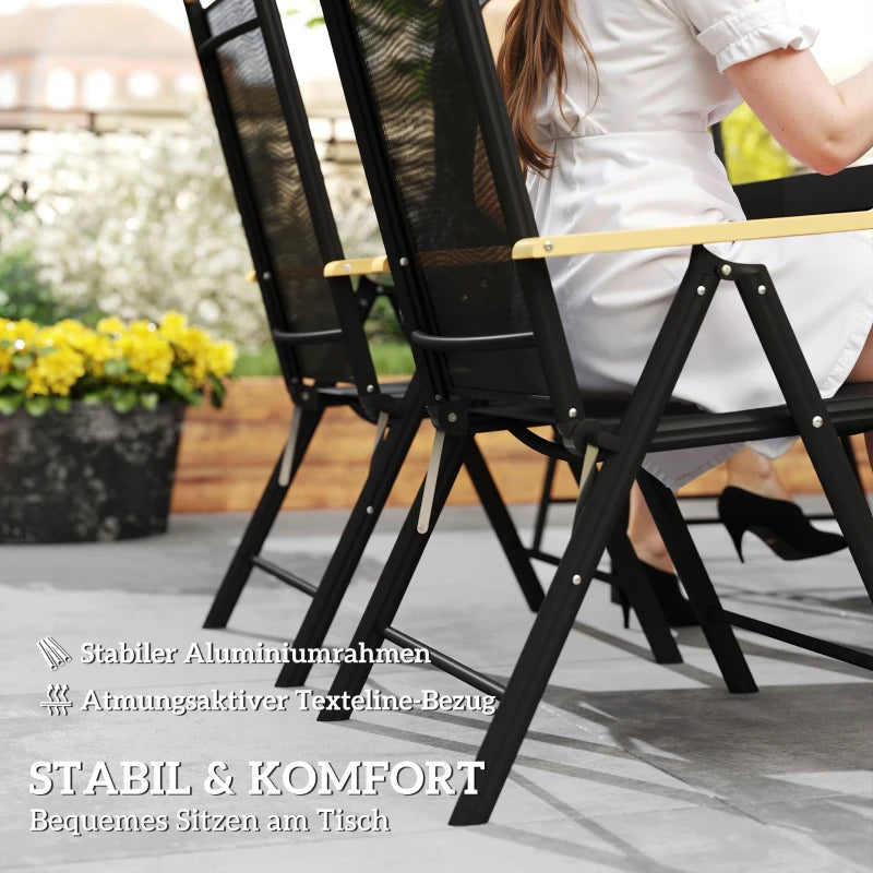 Schaffen Sie einen einladenden Essbereich auf jeder Terrasse mit diesem charmanten Esstischset von Outsunny! Die Rückenlehnen der Stühle sind in 7 Stufen verstellbar, sodass Sie und Ihre Gäste immer schnell die ideale Sitzposition finden. Der robuste Aluminiumrahmen gewährleistet eine besonders lange Nutzung und bei Nichtgebrauch können die Stühle einfach zusammengeklappt und platzsparend verstaut werden. Am großen, pflegeleichten Tisch finden bis zu 6 Personen bequem Platz.